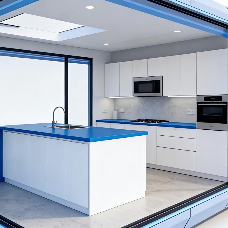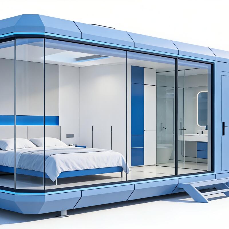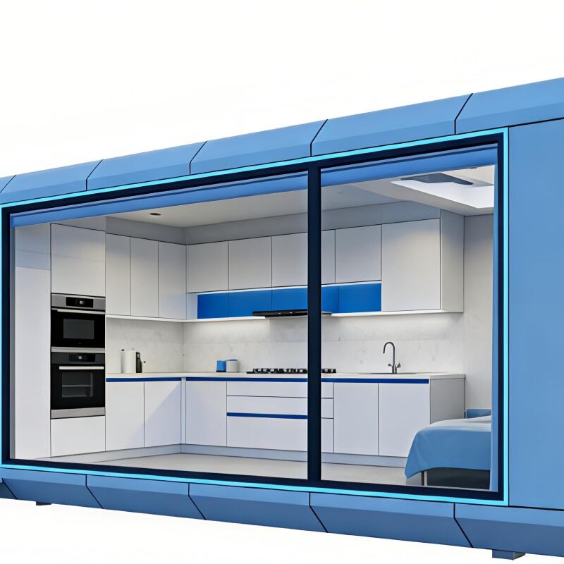 Our Blue Apple Pod Mobile Living Cabin is a sleek, all-in-one portable living space designed for leisure retreats, backyard getaways, or glamping sites. This futuristic “apple pod” features a striking blue exterior with LED accent lighting, paired with floor-to-ceiling glass walls that flood the interior with natural light. Inside, it integrates a fully equipped kitchen (with an oven, stovetop, and storage cabinets) and a compact living/sleeping area—all finished in a modern white-and-blue color scheme for a cohesive, high-end look.