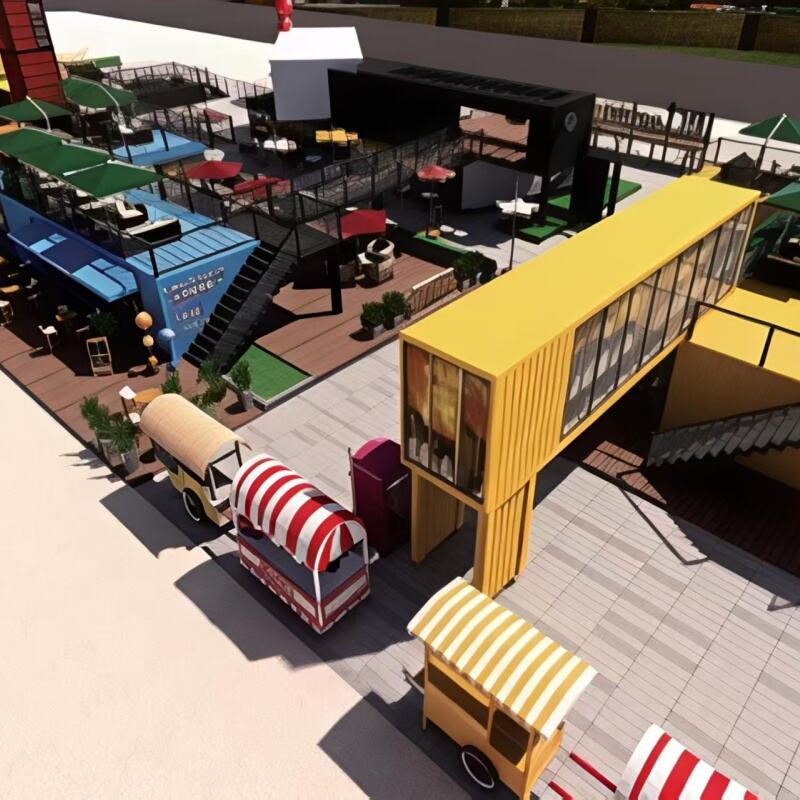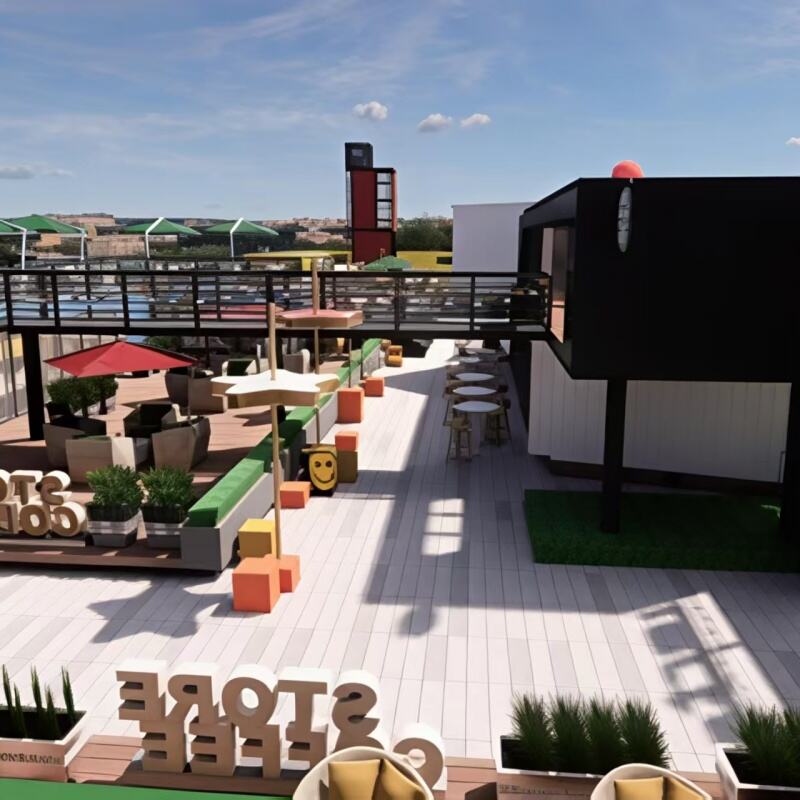 Our Modular Shipping Container Retail Space transforms repurposed shipping containers into fully functional, eye-catching commercial hubs—ideal for urban rooftops, pop-up markets, or outdoor F&B zones (as shown in the design). Each unit is built from durable, weather-resistant shipping containers (eco-friendly upcycling) and customizable to your business needs: add large glass windows for visibility, open-air seating areas, interior partitions for kitchens/counter spaces, or branded exterior finishes (like the bright yellow design in the render).