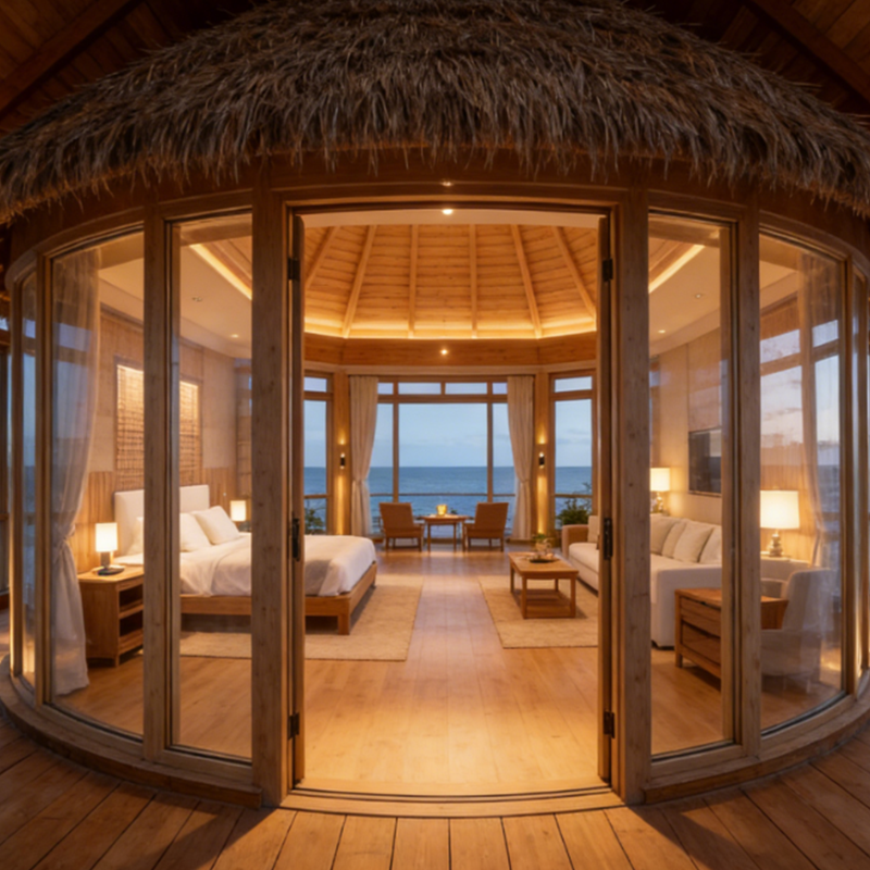 Unlike basic mobile cabins, our thatched design blends tropical charm with modern glass walls—stands out in glamping/rental markets (guests pay 20-30% more for the "luxury nature vibe").